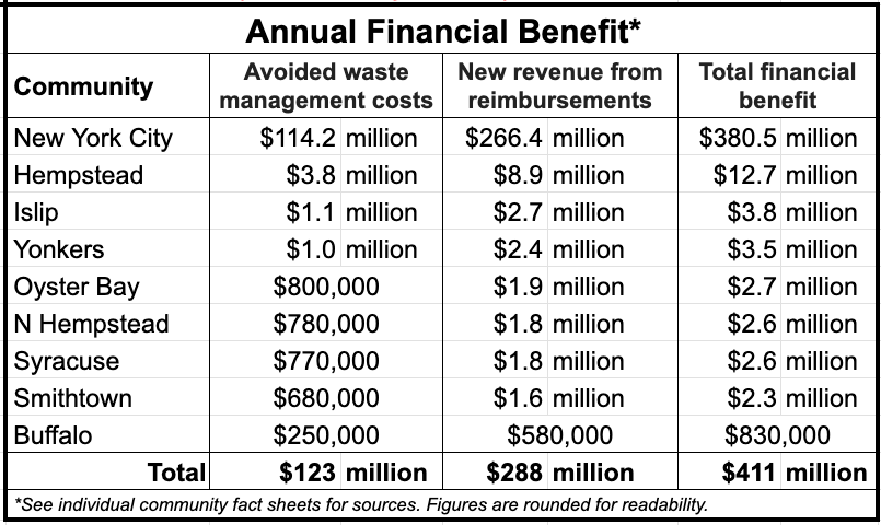 As the attached table shows, an estimated $411 million in annual financial benefits - avoided waste management costs (savings) and revenue from reimbursements - will be realized by just nine selected communities when the law is fully implemented.