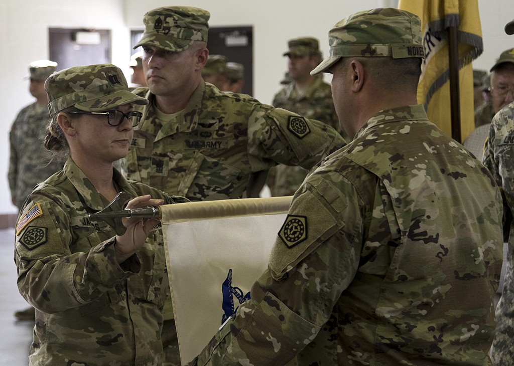 Cutline 2Cpt. Alison Jacobs of Rochester, Illinois, commander of the 126th Quartermaster Company, and Maj. Shawn Nokes of Springfield, Illinois, executive officer for the 232nd Combat Service Support Battalion uncase and unroll the 126th's new guide-on during a reflagging ceremony at the Quincy Readiness Center in Quincy, Illinois, Nov. 6. The quartermaster company inherited the lineage and honors of the 126th Service and Supply Company, formerly based in Quincy, Illinois, and will carry that honor forward. The 126th is the only unit in the Illinois Army National Guard to have been deployed to Viet Nam. (U.S. Army photo by Sgt. 1st Class Bryan Spreitzer, Illinois National Guard Public Affairs)