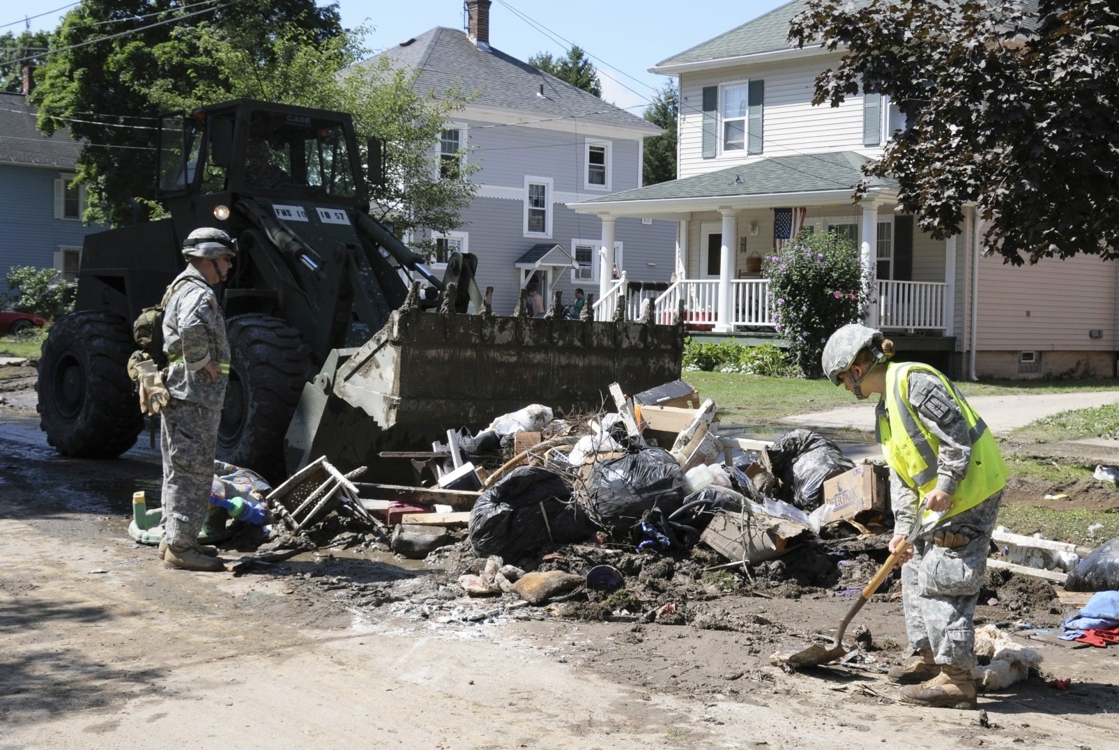 New York Army National Guard Staff Sgt. Greg Ciszak (right) and PFC Erica Gilbert clean the streets here on Thursday, August 13. Spec. Bradley Gabel, a resident of Gowanda, is operating the bucket loader. Gov. David Paterson mobilized the 152nd Engineer Support Co. to aid Gowanda residents in recovering from storms that caused extensive damage in Cattaragus County in Sunday, August 9.