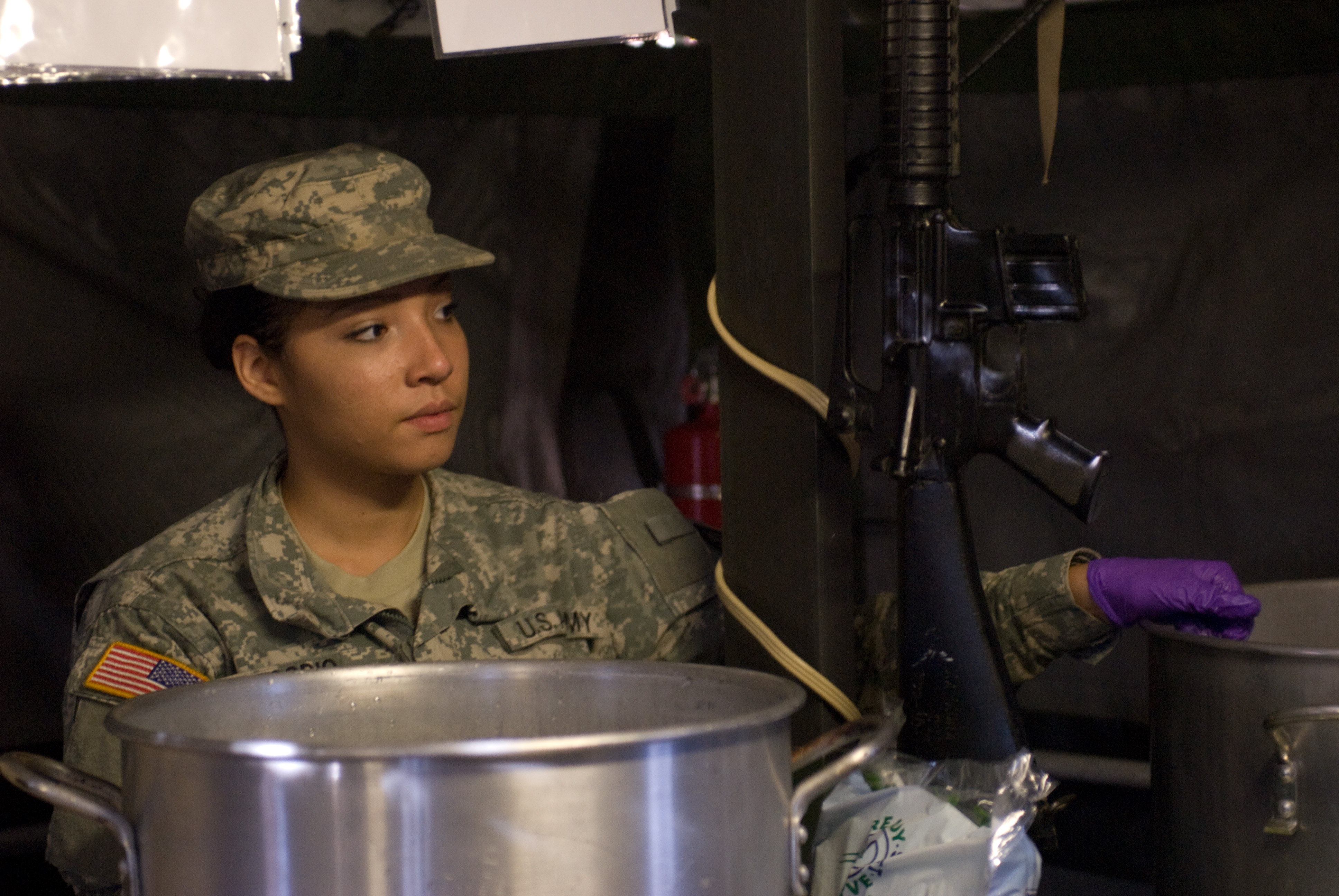 New York Army National Guard Pvt. Daiamy Osario, a New York City resident and a member of the 204th Engineer Battalion's mess section, prepares vegetables to accompany a turkey dinner the cooks made on Saturday. Nov. 13, as they competed to earn the Philip A. Connelly Award of Excellence in Army Food Service.