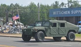 Cutline: An American flag flies at half staff in the midst of rubble from the tornado that hit Tuscaloosa, Ala., April 27, next to a National Guard Humvee that is part of a traffic control point. Alabama National Guardsmen are working with local law enforcement to assist in traffic control around the city.