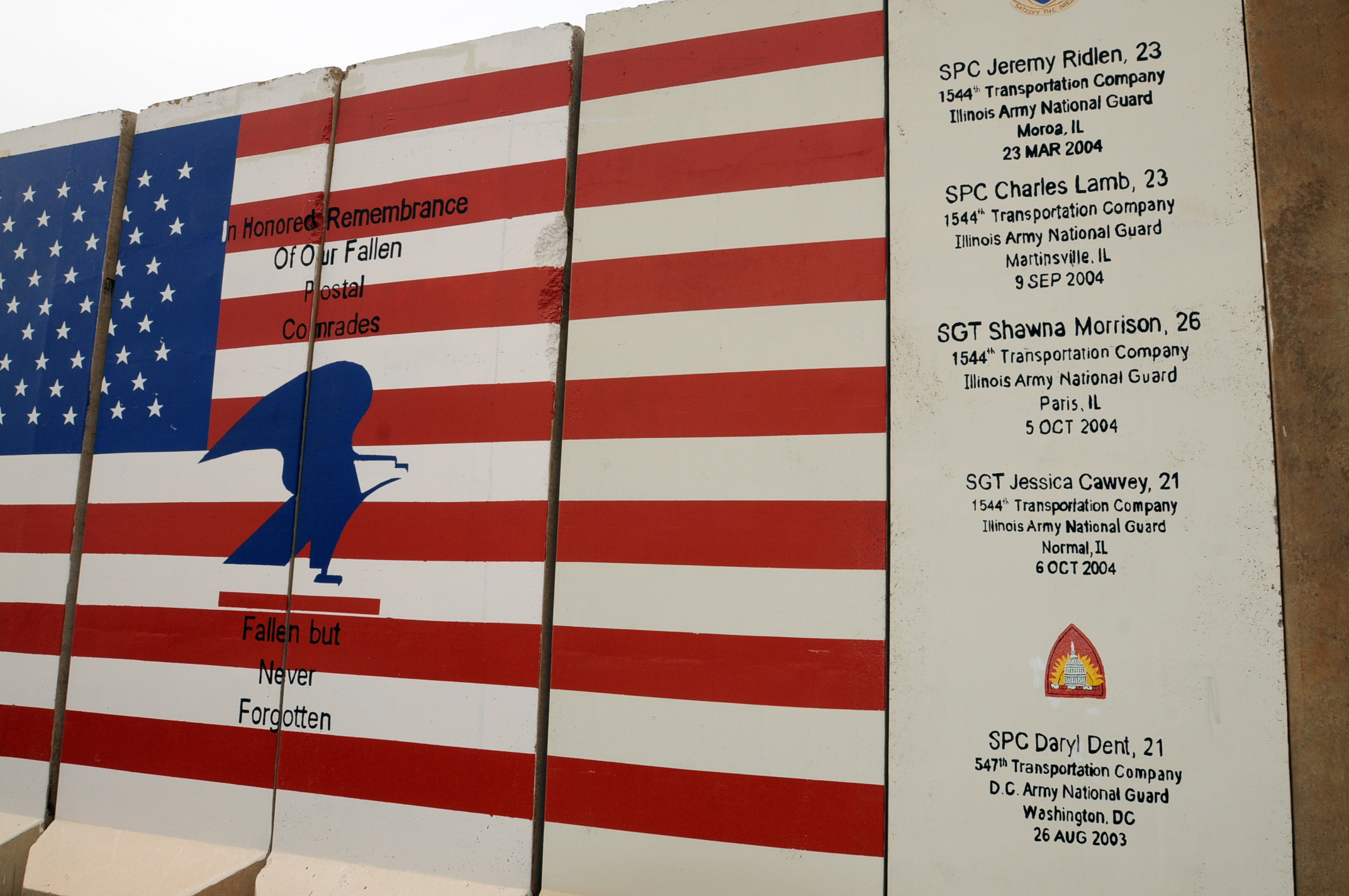 Submitted photo/ Pictured are the protective t-wall barriers listing the names of fallen Soldiers and civilians who played a vital role in postal operations and in the early stages of the war in Iraq. Nearly two years ago, the 13th Sustainment Command (Expeditionary) honored the memory of seven Soldiers and two civilian contractors with a plaque dedication ceremony at the Balad Post Office Dec. 17, 2009 at Joint Base Balad, Iraq.