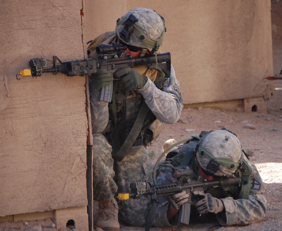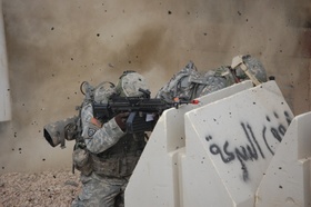 051611-A-9869G-002 – Two infantrymen of the Alabama National Guard's 1st Battalion, 167th Infantry duck for cover after a simulated improvised explosives attack during the mass casualty training lane at the National Training Center at Fort Irwin, Calif., May 16, 2011. Along with the 167th, Alabama's 1103th Combat Service Support Battalion also participated in the training with the Arkansas National Guard's 39th Infantry Brigade Combat Team during the NTC rotation. In total, the Alabama National Guard had approximately 800 Soldiers participate in the training.