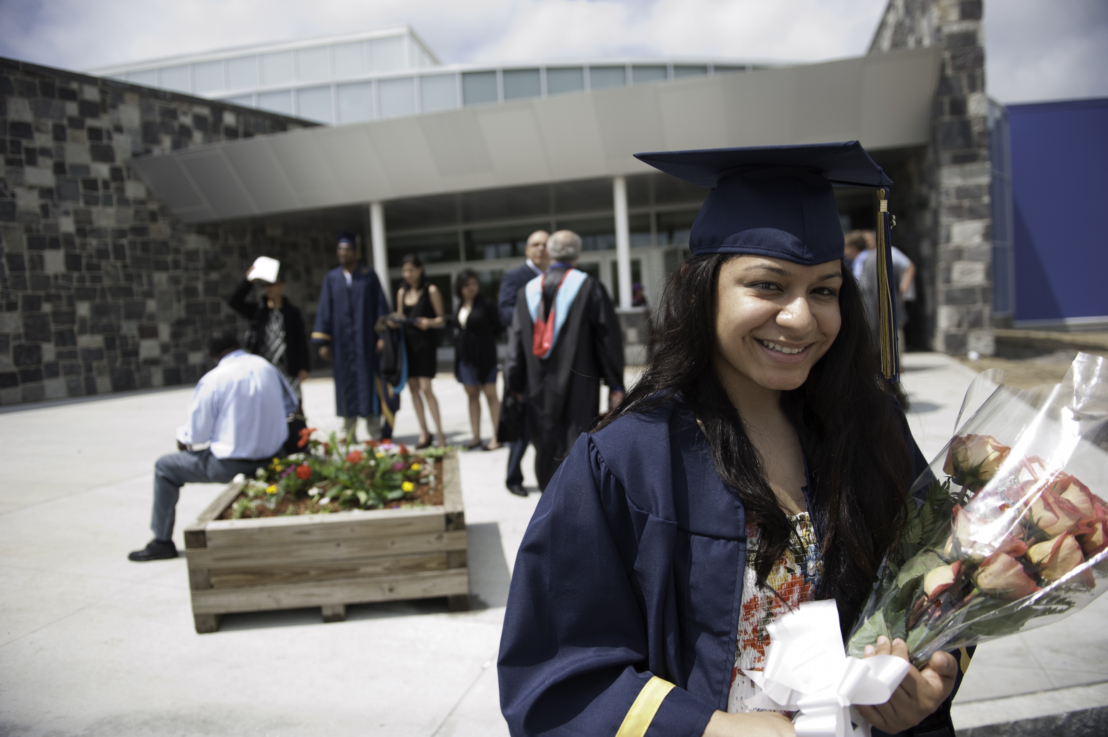Stephanie J. Reid of the Bronx, a law enforcement leadership management graduate, stands in front of SUNY Canton's new Roos House where Commencement was held on Saturday.