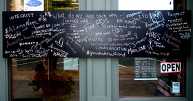 A "democracy wall," essentially a blackboard that invites community participation by posing questions about inequality, will be on display for the next several weeks in front of Main Street SUNY Cortland, at 9 Main St., as part of the Economic Inequality Initiative: Pathways to Opportunity in Cortland County project.