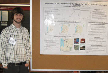 Crawford's winning poster summarizes findings regarding the use of conservation easements to manage rural land use. He discovered that easements have been used to maintain working forests and open land, provide habitat, and improve agriculture. In his research paper, Crawford explored the impact of easements in Vermont and Massachusetts, looked at how tax codes affect conservation easements, and presented the geography of easements in a computer-generated map.