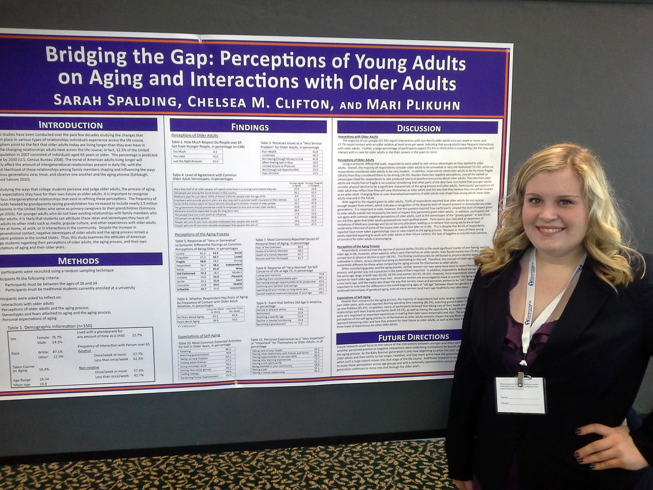 Spalding presented "Bridging the Gap: Perceptions of Young Adults on Aging and Interactions with Older Adults," co-authored with UE assistant professor of sociology Mari Plikuhn and fellow UE sociology major Chelsea Clifton of Montgomery, Indiana.
