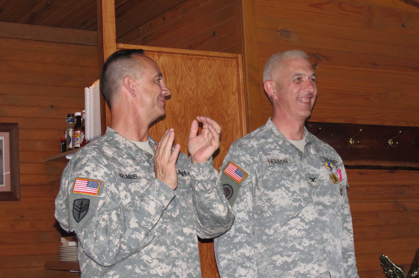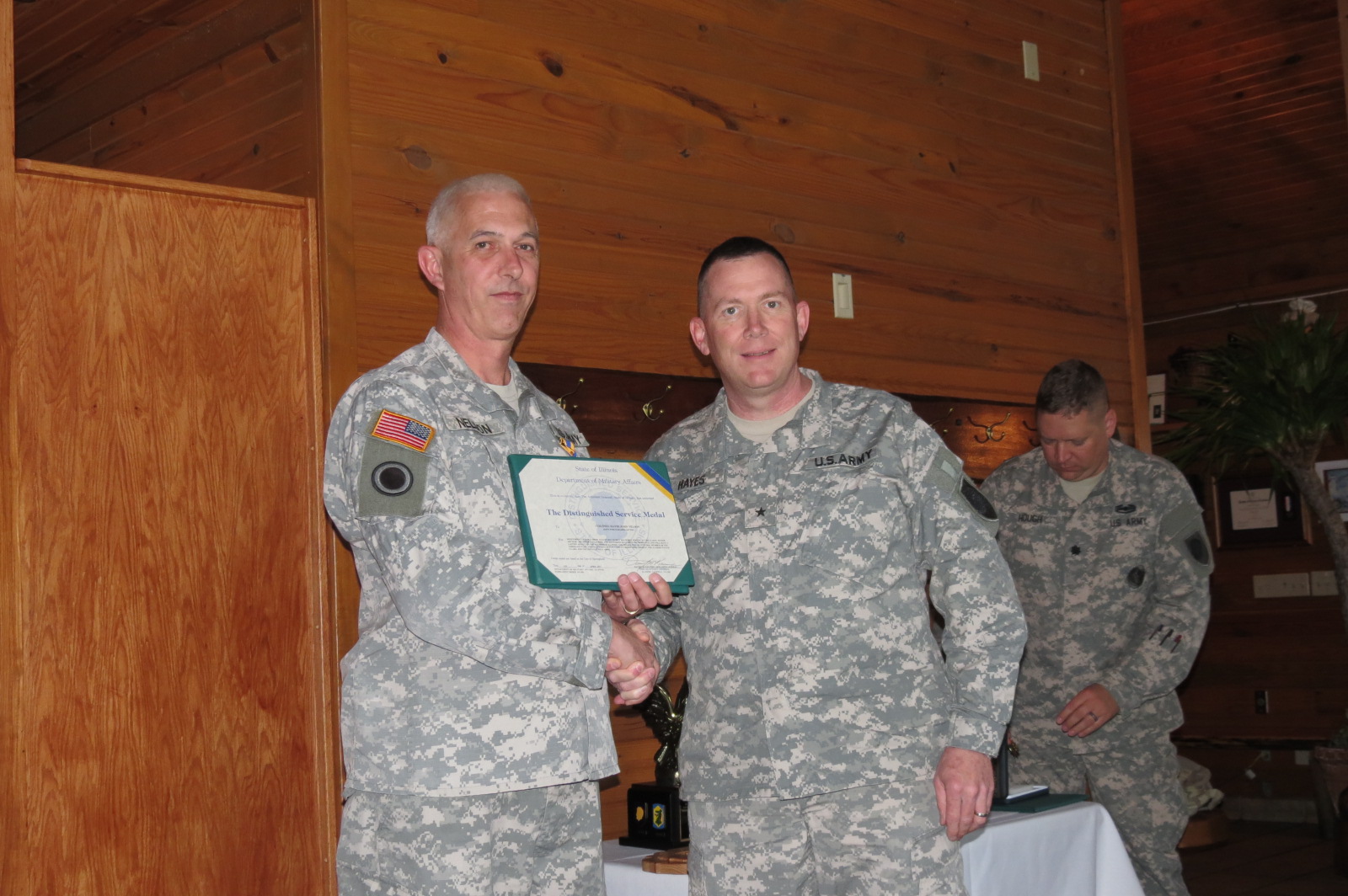 image 2-Col. David J. Nelson of Chatham, Illinois, the Senior Regular Army Advisor Guard (SRAAG) for the Illinois Army National Guard (ILARNG), is honored at a luncheon May 6, at Mariah's restaurant in Springfield, Illinois, by Brig. Gen. Richard J. Hayes of Chatham, Illinois, the Assistant Adjutant General-Army for the Illinois National Guard. Nelson received the Illinois Military Distinguished Service Award, the Army Legion of Merit and other awards during the event. He will retire in late August after 32 years of service. (Photo provided by Col. David J. Nelson)
