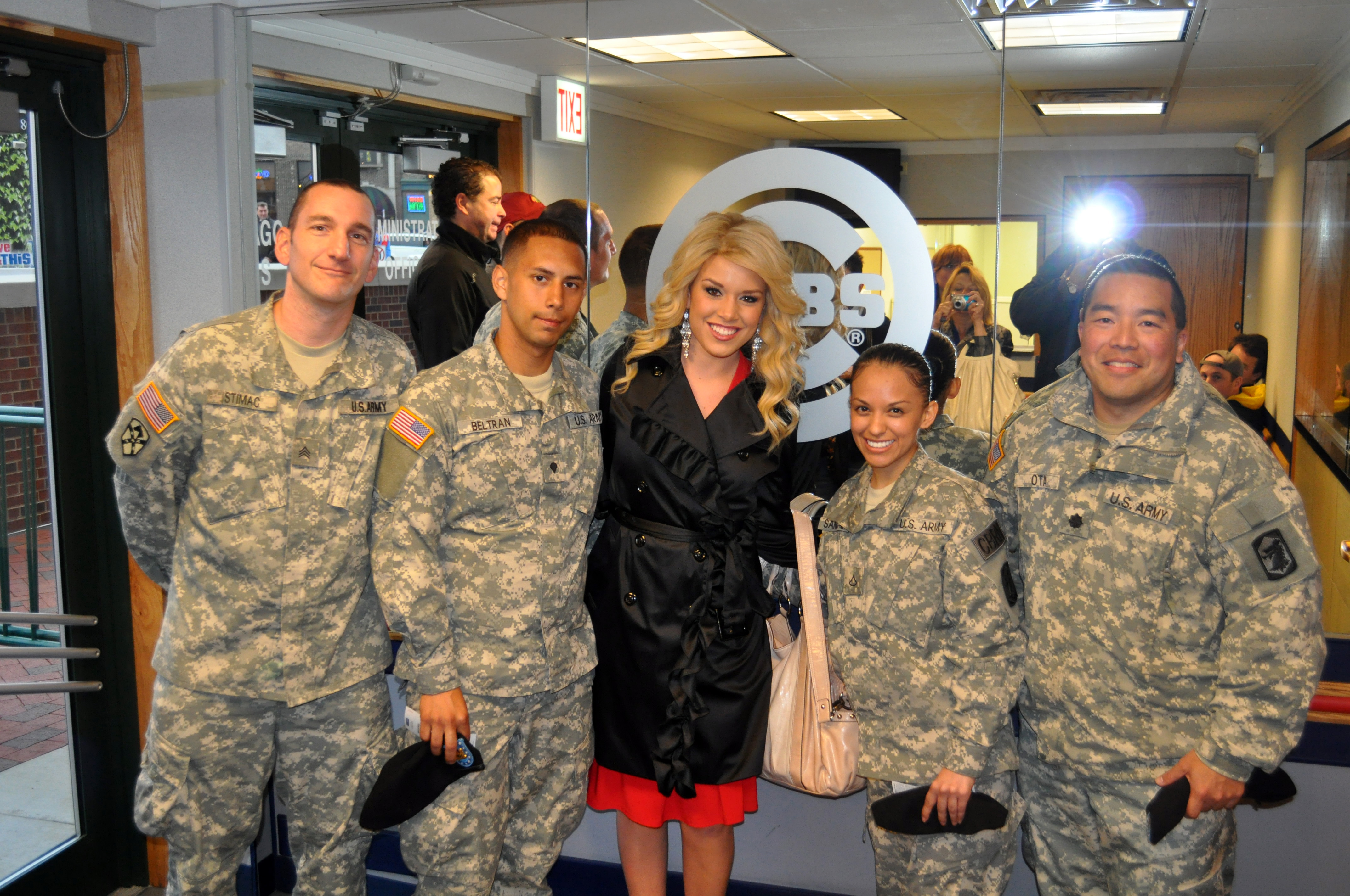 Pictured from left to right: Sgt. John Stimac, Spc. Roberto A. Beltran, reigning Miss America, Teresa Scanlan and Pfc. Cindy Sandoval pose for a picture May 14 at a Chicago Cubs game in Chicago.
