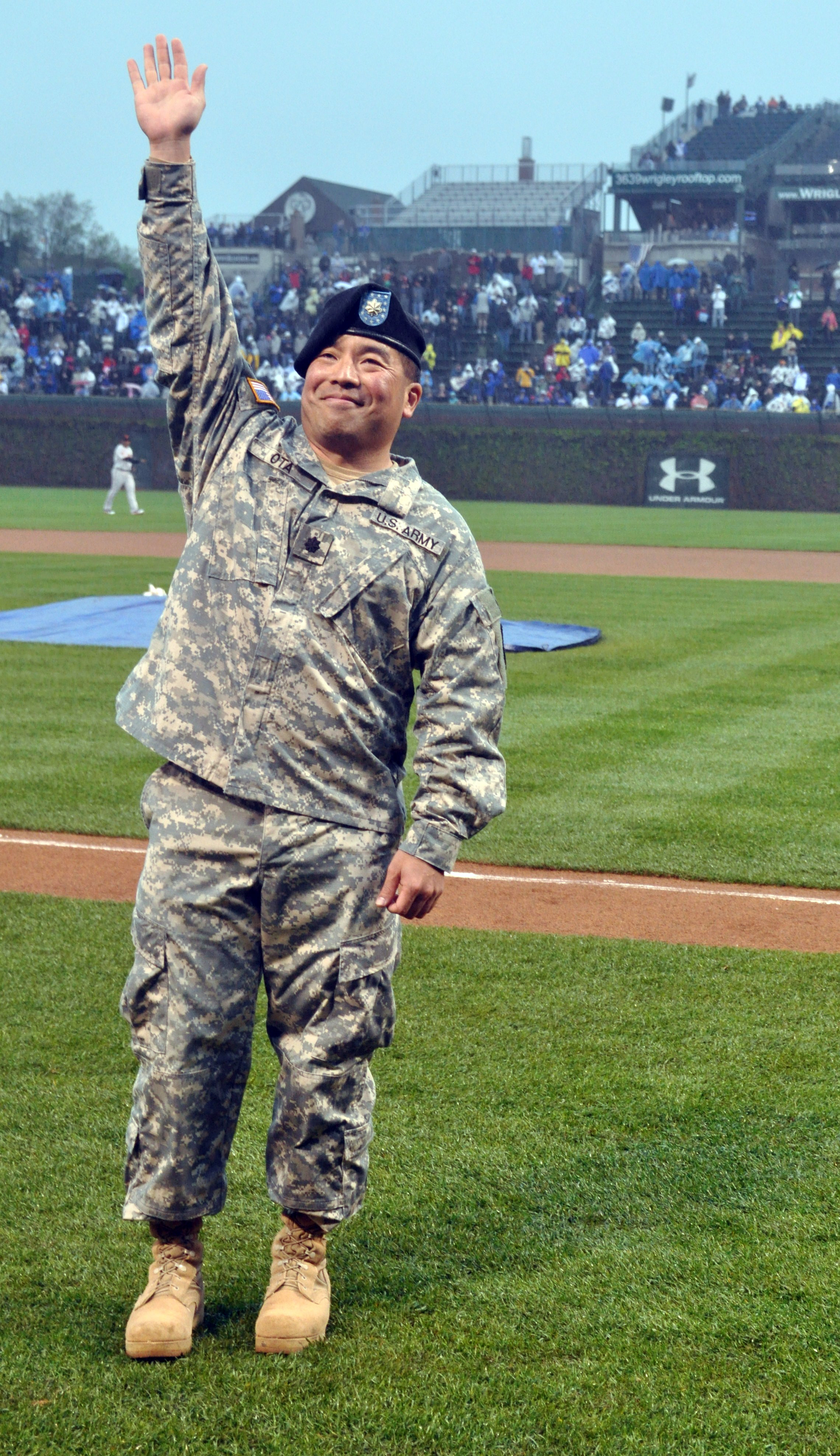 Lt. Col. Gregory S. Ota waves to the crowd at Wrigley field before the Cubs played the defending World Series champions, the San Francisco Giants, May 14 in Chicago.