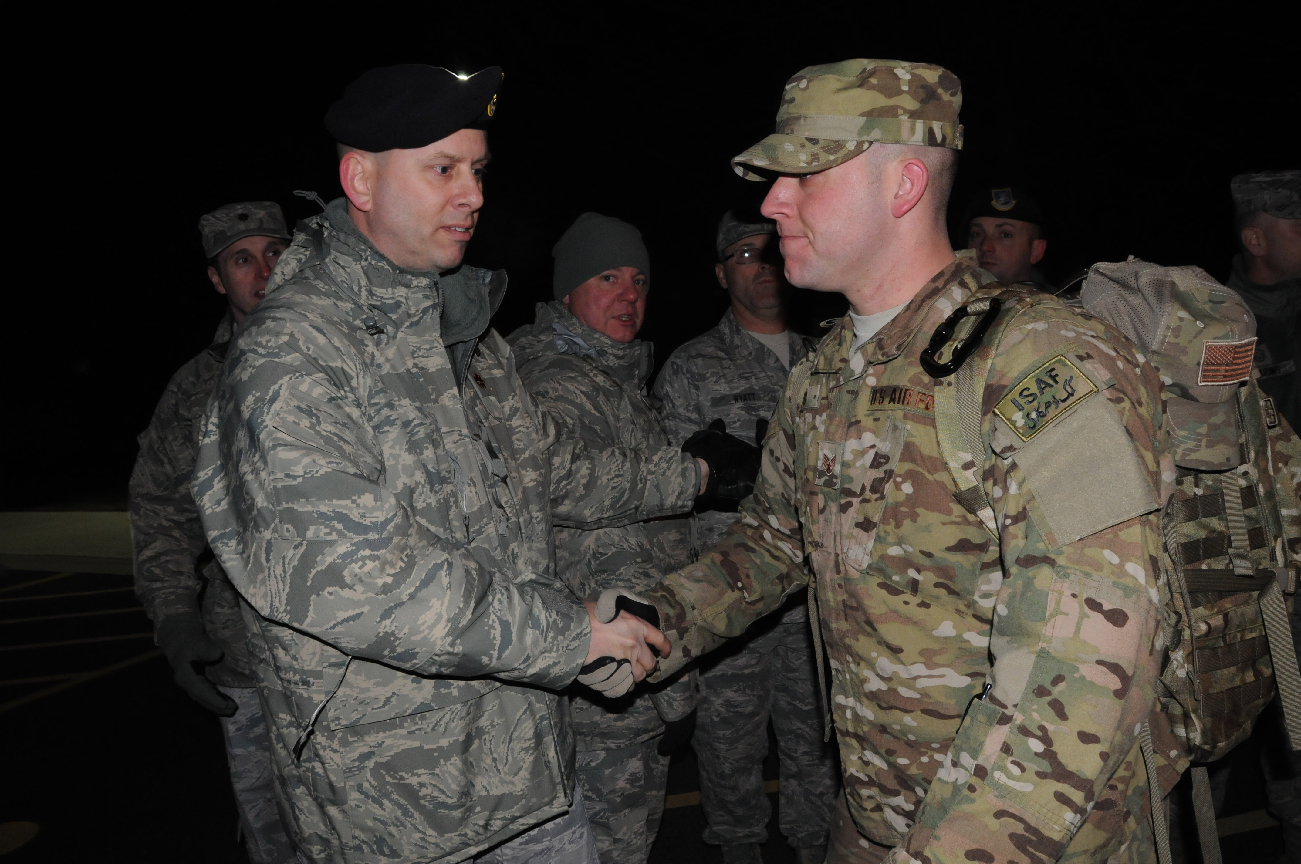 U.S. Air Force photo by Master Sgt. Shaun Kerr, 183rd Fighter Wing Public Affairs/ Maj. James Robinson of Springfield, the 183rd Fighter Wing's Security Forces Squadron commander shakes the hand of a deploying Airman, Feb. 20 in Springfield. Approximately 25 Airmen deployed in support of Operation Enduring Freedom.