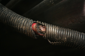 Richard Barlette, Chief of the OFPC Arson Bureau, said the equipment failures in the fires the bureau investigated were caused by electrical short circuiting as a result of worn electrical cable insulation. (See attached Photo A.) These failures appear to occur where large capacity electrical cables come in contact with the chassis frame or short to the ground. Additional electrical equipment problems have been discovered attributable to missing or improper fusing of installed equipment.