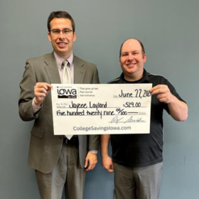 Drew Layland, the winning entrant, met with Smith at the Williamsburg Public Library for a check presentation and discussed the importance of his College Savings Iowa account for Jaycee. "Investing in my daughter's future is something that has always been important to me," said Layland. "While looking for a way to do that, I came across College Savings Iowa 529. It's a convenient and easy-to-use platform that I would recommend to anyone! My daughter and I would just like to say thank you for the amazing contribution of $529 that is going towards her future!"