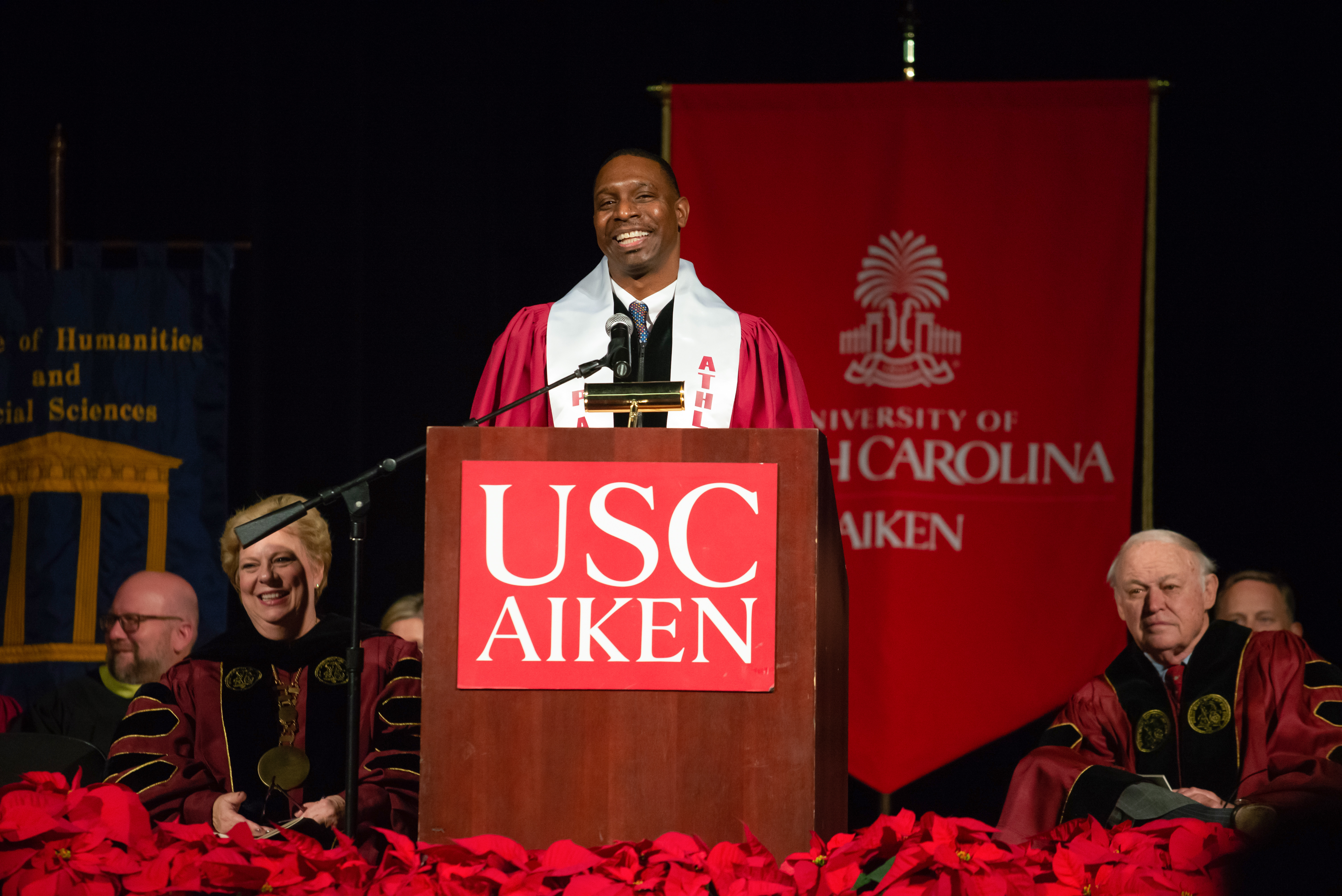 USC Aiken alumnus, Antonio D. Evans, was the guest speaker during the December convocation ceremony. More than 200 students and their families learned about his journey since he graduated in 2001.