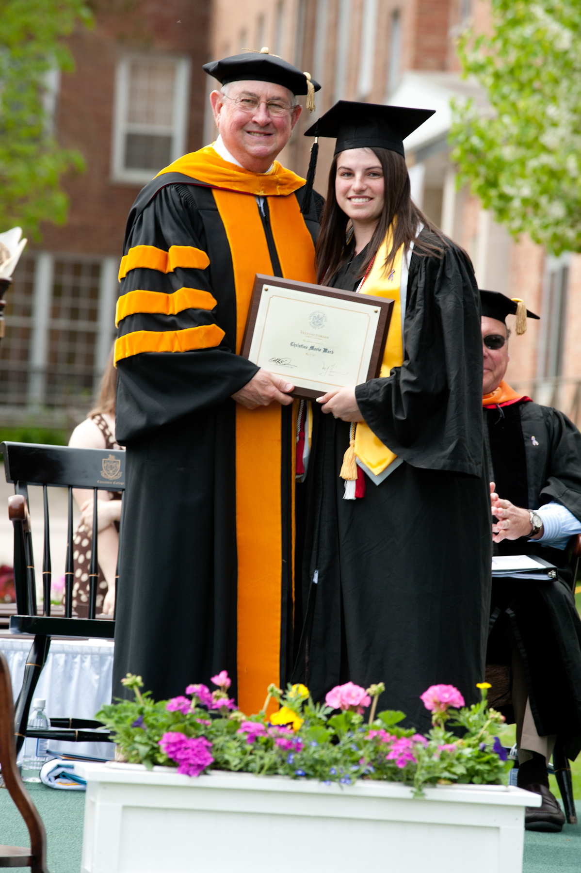 Photo: Valedictorian Christine Ward, on stage at Cazenovia College's 188th Commencement Ceremony, with Dr. Donald A. McCrimmon, the College's dean of academic affairs.